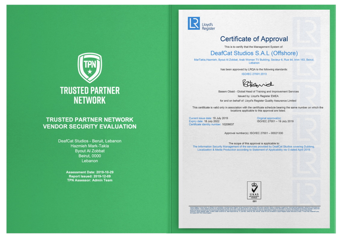 In the age of globalization, content security and management has become a top priority for international content creators and distributors. Today our infrastructure conforms to the ISO standard for information security and management in order to make sure that our clients content are kept private and secured.
